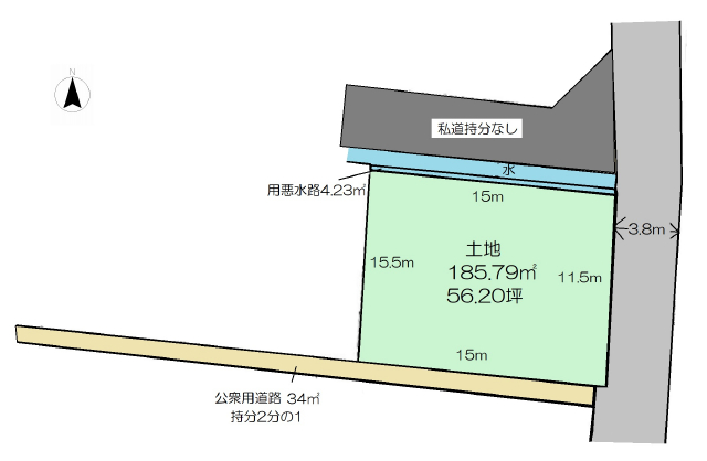 住宅用地、公営水道13㎜、公共本下水、都市ガス、側溝、建物解体更地渡し、建築条件なし、間口10m以上、角地、公簿取引、建築基準法22条区域、宅地造成等工事規制区域、平坦地、宅地の他①用悪水路4.3㎡②公衆用道路34㎡(持分2分の1)あり |